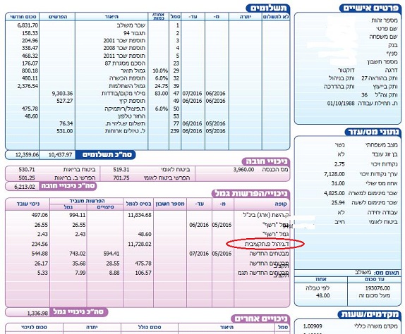 א. בפנסיה תקציבית – בתלוש השכר תחת הכותרת: ניכויי/הפרשות גמל מופיע סעיף בשם "ד. ניהול פנסיה תקציבית". להלן דוגמא לתלוש כזה: